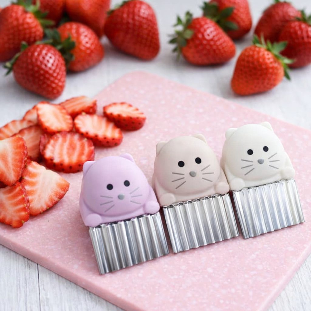 Odolné nože z nerezovej ocele s rukoväťami v dizajne roztomilej mačičky umožňujú ľahké krájanie a kosenie zeleniny, ovocia a ďalších potravín! Ľahko a hravo s nimi vytvoríte domáce vlnité hranolky, šaláty, sendviče, syry, sušienky a mnoho ďalšieho! Vyberte si z 3 rôznych designov čepele - vlnkovaná, cik-cak alebo hranatá. Rôzna textúra krájania podporí záujem detí o jedlo a najmenším deťom uľahčí samostatnosť pri stravovaní a servírovaní klzkých potravín.