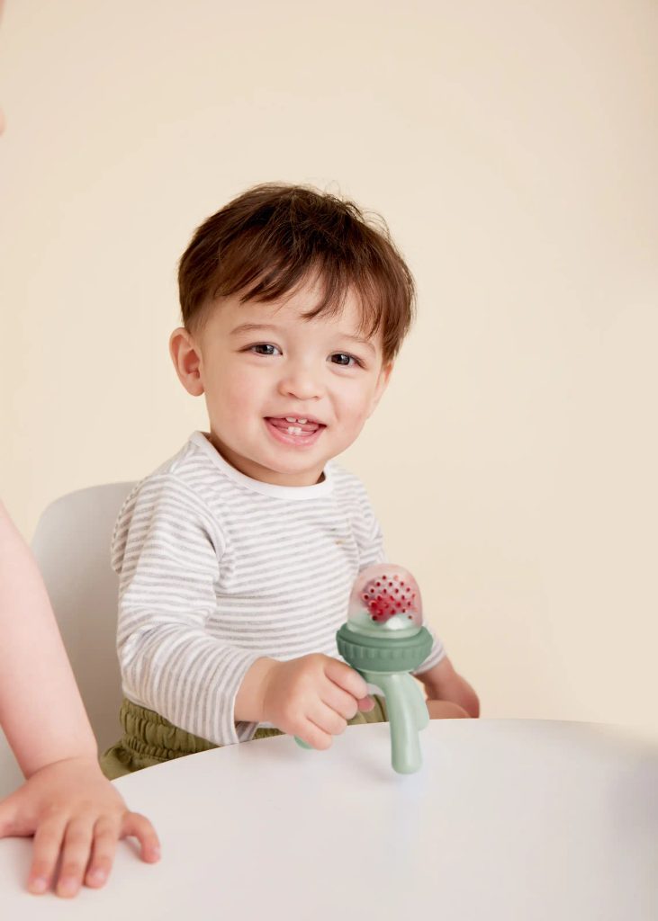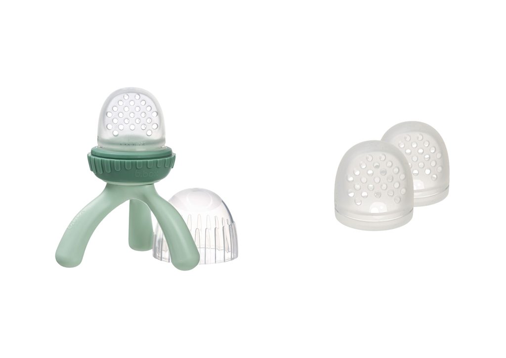 Kŕmiaci cumlík a hryzadlo s mäkkou silikónovou sieťkou od obľúbenej austrálskej značky b.box umožní deťom od 4 mesiacov bezpečne spoznávať nové potraviny bez obáv z vdýchnutia väčších kúskov. Stačí odskrutkovať krúžok, naplniť silikónovú sieťku ovocím či zeleninou a nechať dieťa objavovať svet chutí vlastným tempom.