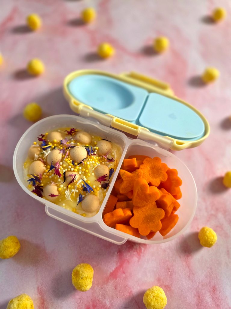 Vďaka flexibilnému silikónovému viečku na jednej strane môžete do krabičky vložiť celý kus ovocia (napr. jablko) a do druhej treba aj jogurt alebo pyré (nie tekutiny). Jednoduché otváranie umožní deťom samostatne sa obslúžiť.
