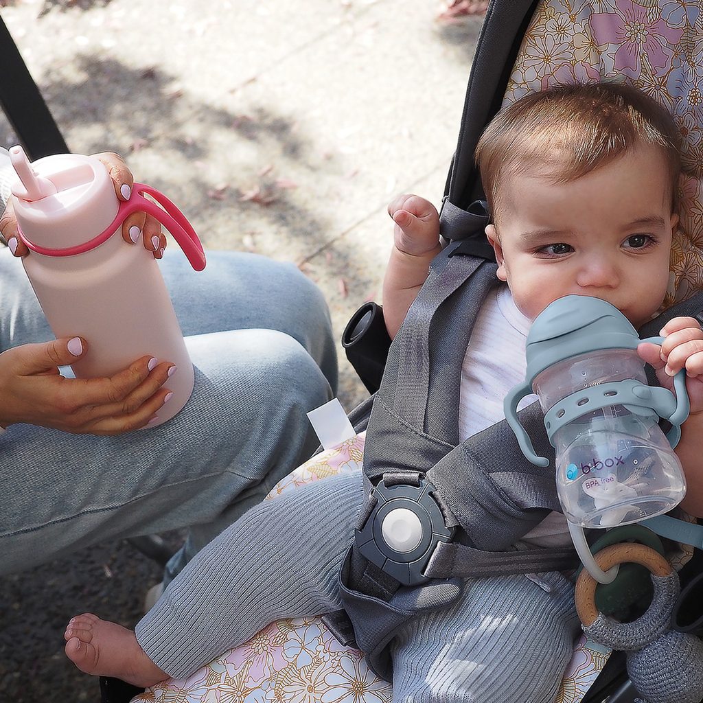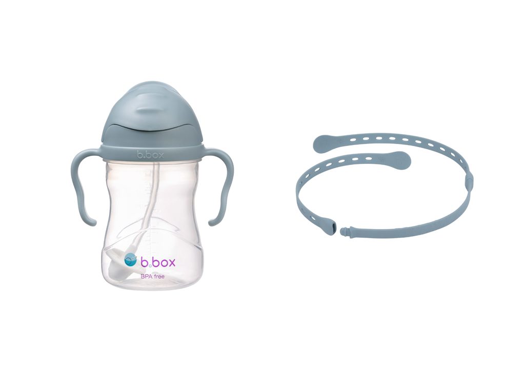 Ideálna kombinácia produktov b.box pre každodenné používanie - hrnček zaistí pohodlné pitie, zatiaľ čo pásik zabráni jeho strate alebo pádu.