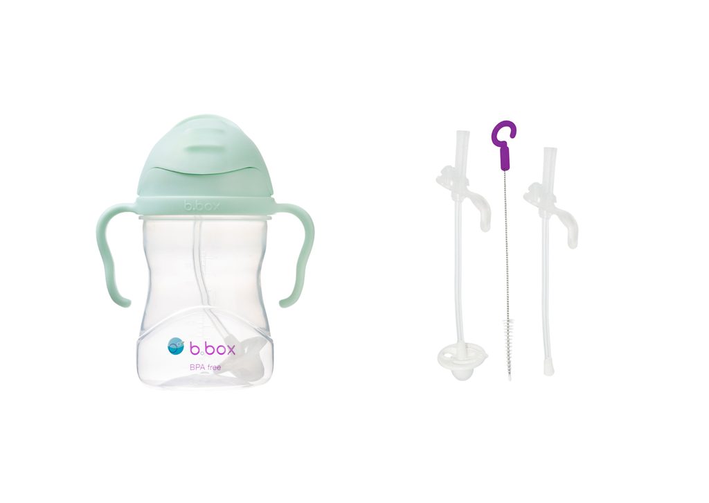 Hrnček sa dodáva v praktickej súprave s náhradnými slamkami a čistiacou kefkou. Základňa hrnčeka je kompatibilná s viečkom hrnčeka pre batoľatá b.box.
