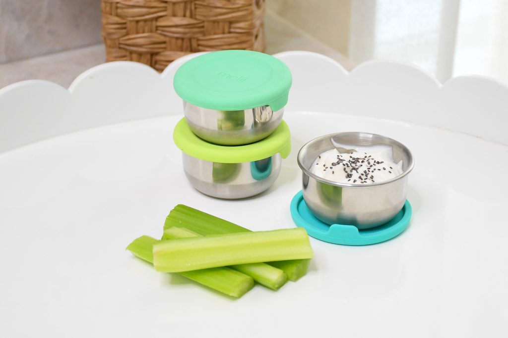 Súprava 3 nerezových mini dóz s farebnými silikónovými viečkami – ideálna na dipy, omáčky, desiaty aj na cesty. Ľahká, tesniaca a vhodná pre deti i dospelých.
