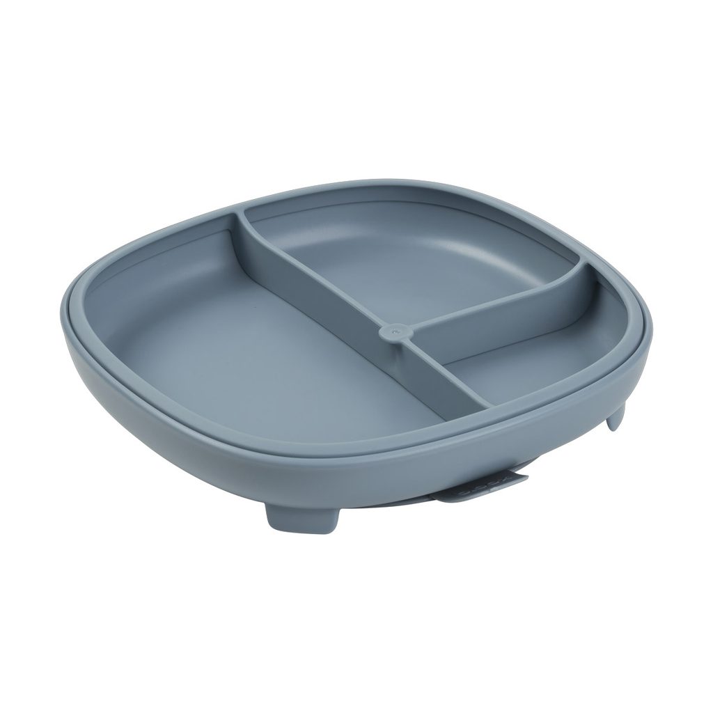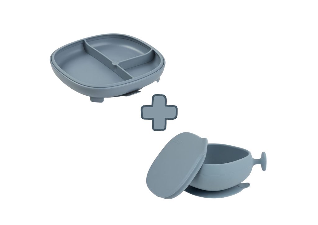 Set v modrej farbe kombinuje dva produkty značky b.box s prísavkou – delený tanierik 2v1 a silikónovú misku s viečkom s objemom 300 ml.