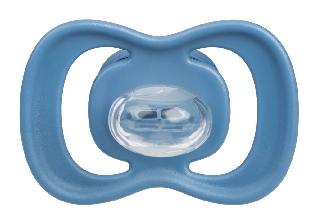 Symetrická farebná vonkajšia časť cumlíka s vetracími otvormi (štít) obsahuje antimikrobiálnu prísadu na báze striebra, ktorá eliminuje až 99,9 % baktérií. Terčík s vetracími otvormi pokrýva menšiu časť pokožky okolo úst dieťaťa, čím sa znižuje riziko vzniku nežiaduceho ekzému pod cumlíkom. Symetrické tvarovanie farebného štítu zaisťuje optimálnu priechodnosť vzduchu pod nosom dieťaťa.